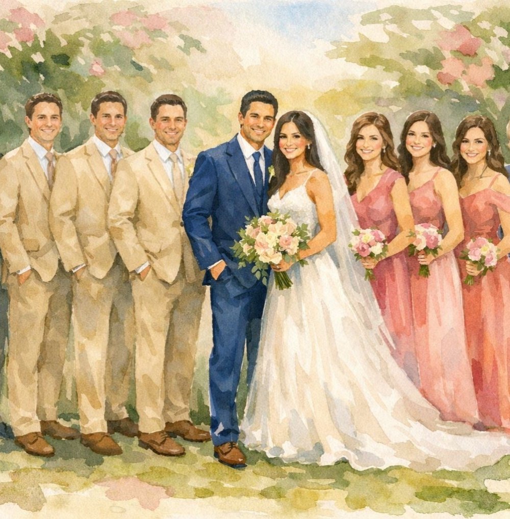 Padrinhos: Terno Completo na cor Bege (Paletó e calça Social, Camisa Social na cor Branca e Gravata Bege).